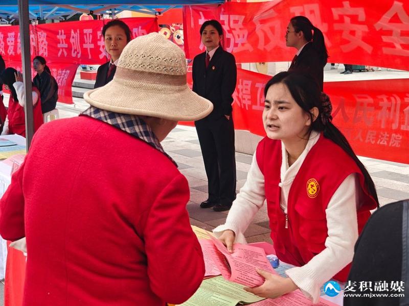 当天上午9时,天水火车站站前广场人流如织、气氛热烈。广场四周悬挂着醒目的红色主题宣传标语,两侧整齐排列着20余个宣传展台。来自区委国安办、区委政法委、麦积公安分局、区司法局、区消防救援大队等20余家区直单位及企业的宣传人员早早就位,围绕防范电信诈骗、保守国家秘密、抵制邪教侵蚀等热点问题,耐心细致地解答群众咨询,引导大家自觉扛起维护国家安全的责任。广场上的广播同步循环播放国家安全宣传教育录音,让来往市民在潜移默化中接受国家安全教育。