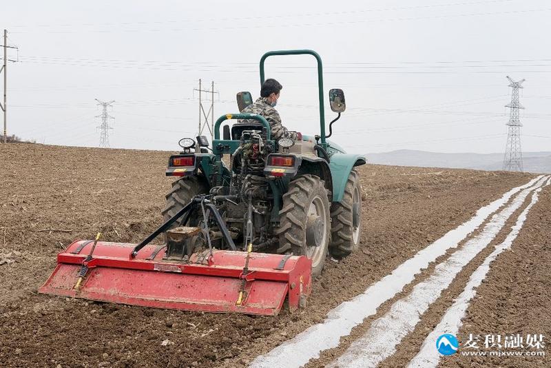 在花牛镇佰顷塬千亩玉米大豆带状复合种植基地,顶凌覆膜工作正紧锣密鼓、有条不紊地推进。和煦春风裹挟着清新的泥土芬芳扑面而来,大型覆膜机轰鸣作业、高效运转,驶过之处留下一道道整齐规整的垄沟。地膜紧密贴合地面,牢牢锁住土壤墒情,为后续作物茁壮成长筑牢根基。