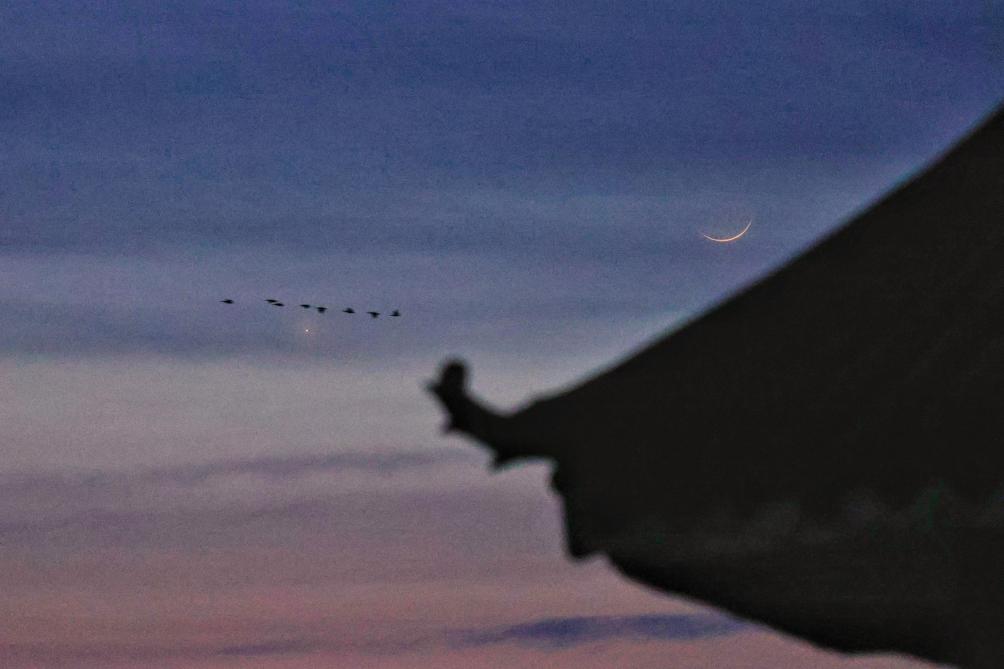 2023年2月22日傍晚在北京市西城区拍摄的金星伴月。(王俊峰 摄)
