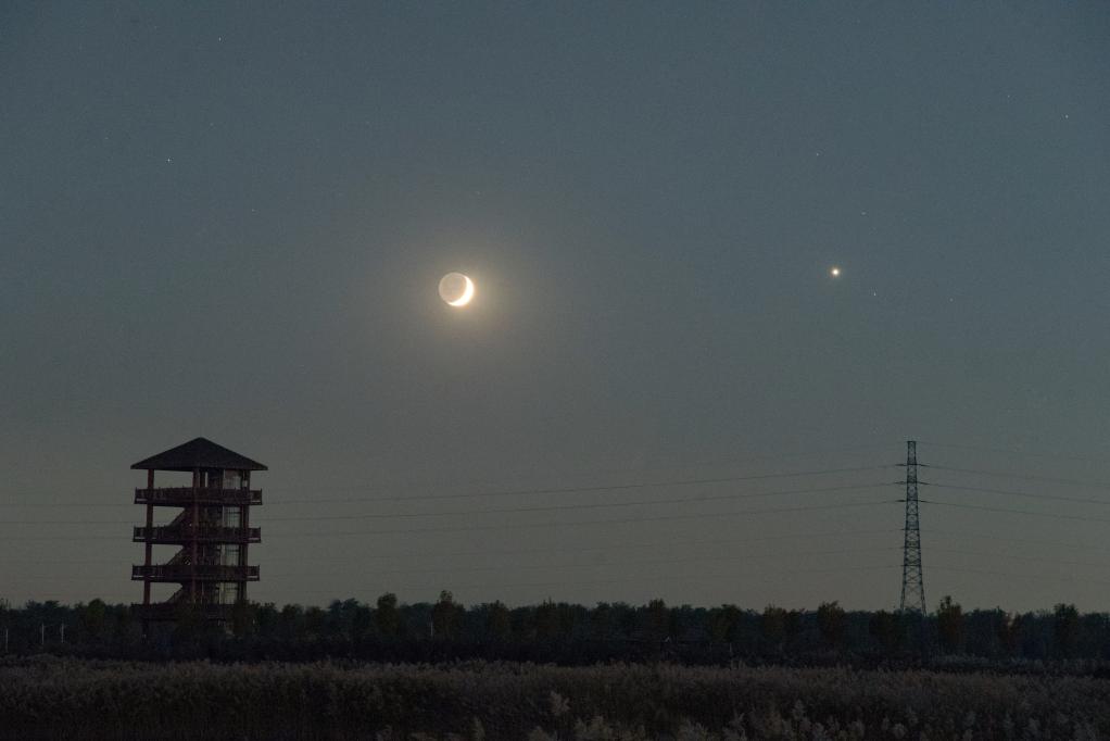 2024年11月5日傍晚在天津市静海区拍摄的金星伴月。(杨婧 摄)