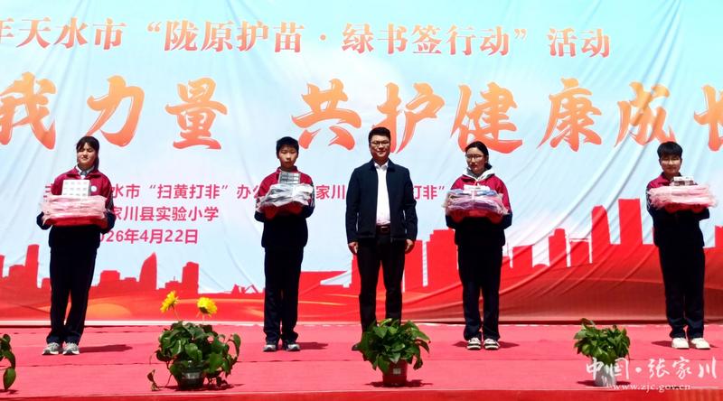 同期,2026年天水市“陇原护苗·绿书签行动”在张家川县实验小学举行,以“汇聚你我力量 共护健康成长”为主题。参会领导和嘉宾现场向学生代表发放了绿书签,家校社代表共同宣读倡议书,现场公布上年度省、市、县“我的书屋·我的梦”阅读实践活动获奖名单,甘肃易德集团向学生代表捐赠学习用品。
