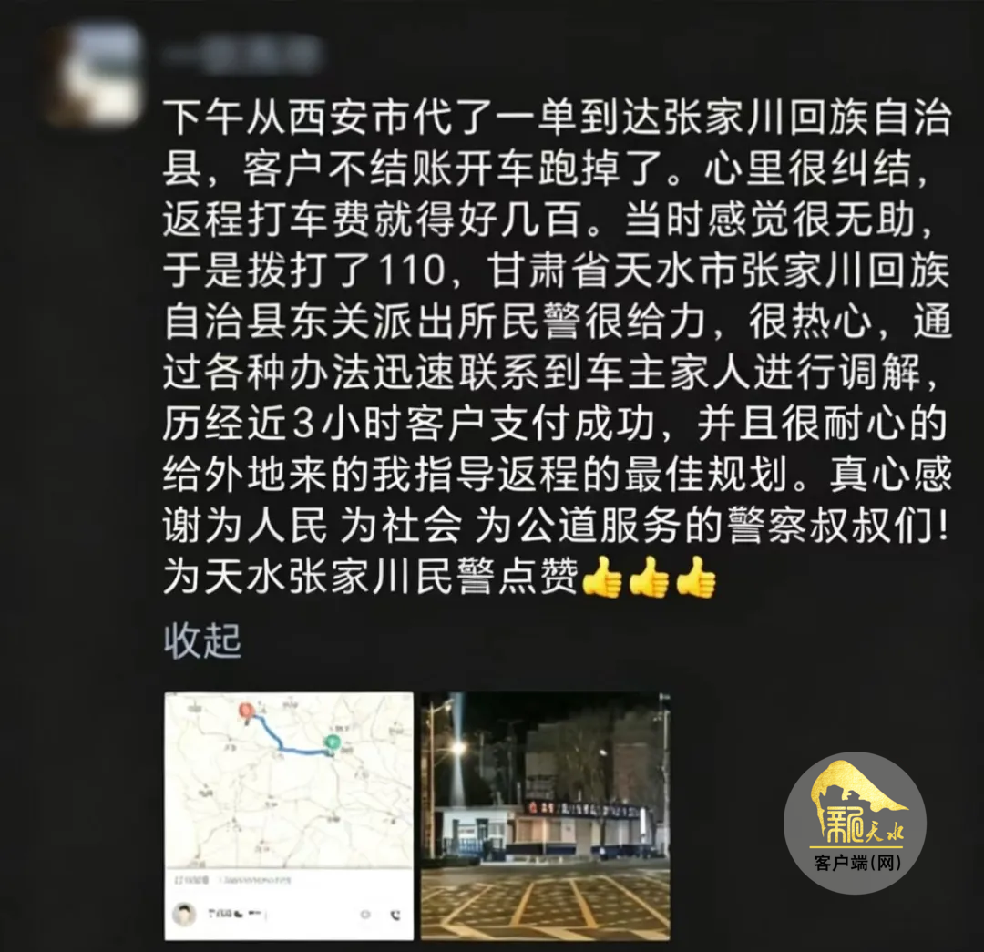 时间回拨到当日凌晨,张家川县公安局东关派出所值班室的报警电话骤然响起。电话那头,这位代驾司机的语气焦急而无助:“我从西安接了一单,把人安全送到张家川后,车主没付钱就开车走了,我联系不上他……”