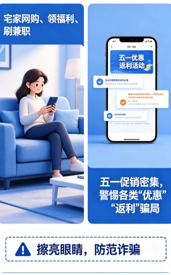 尤其是五一期间电商促销密集,各类“优惠”“返利”信息层出不穷,一定要擦亮眼睛!